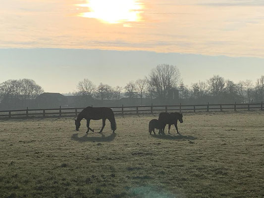 Am Abend um 17h will ich ihn reinholen, wie immer um 17h. Die ganze Herde steht noch gaaanz hinten und scheint keine Lust zu haben, bereits in die Boxen zu gehen. Ich warte eine Weile – keiner kommt. Also gehe ich nochmals ins Haus, esse was Kleines und als Willemiek mir um 17.30 schreibt, dass sie die Pferde reinholt, stehen alle vorne am Gatter. Lustig, offenbar wissen sie: wenn Willemiek kommt, dann geht es rein. Dark steht zuvorderst und Willemiek meint nur: Deiner scheint nun der Chef zu sein. Und tatsächlich, alle anderen warten brav, bis Dark zuerst reingenommen wird. So geht wieder ein wunderbarer, entspannter Tag zu Ende.