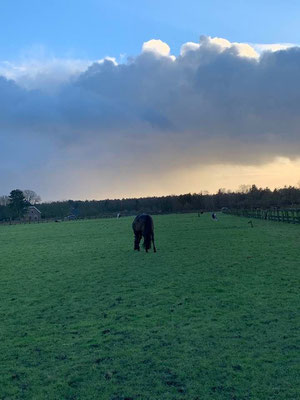 Ich weiss nicht, was heute mit ihm los ist, solange er nicht abhaut oder los bockt, sind mir seine «Erschrecker» egal. Als wir zurück sind, scheint die Sonne zusammen mit Hagel und es tut sich über dem Stall ein wunderbarer Regenbogen auf. Das Licht ist magisch und als ich Dark wieder auf die Weide lasse, zeichnen sich beeindruckende Wolkenfelder am Himmel ab.