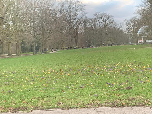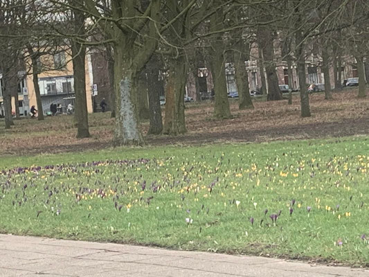 Mitten in Zandvoort steigt dann mein Navi aus, bzw. mein Natel hat kein Pfuus mehr und stellt ab. Ja ich kann es zwar wieder anstellen und auch im Auto aufladen, aber ich weiss meinen PinCode nicht auswendig. Oje, wie komme ich jetzt mitten aus Zandvoort raus nach Hause - ohne Navi? Ich beschliesse, einfach mal Richtung Amsterdam und dann Utrecht zu fahren, das habe ich von der Hinfahrt noch in Erinnerung. Die Richtung stimmt glaub irgendwie, allerdings gerate ich jetzt mitten in den Feierabendverkehr in Haarlem. Als ich im Stau warte, entdecke ich auf der Strassenseite eine Wiese mit vielen bunten Krokussen, die aus der Erde gucken und einen farbigen Teppich bilden. Wow, der Frühling will definitiv durchbrechen! Meine Weiterfahrt wird dann von grünen Streifen am Wegrand geleitet, auf der blühende Osterglocken stehen, zu Tausenden! Wie haben diese Blumen bloss die letzten Regen-, Sturm- und Wintertage überlebt??? Auf jeden Fall sieht es superschön aus!