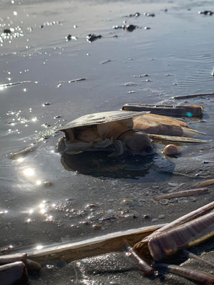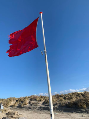 Kaum aus dem Auto gestiegen, werde ich fast weggepustet von einem sehr starken Wind, der dann nach den Dünen auf dem Strand noch einen Zacken zulegt. Es ist die rote Fahne gehisst, also Sturm … einige Kiteboarder haben es sich trotzdem nicht nehmen lassen, ihrem Hobby zu frönen und zieren mit ihren bunten Segeln den Himmel über dem Strand.