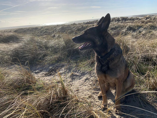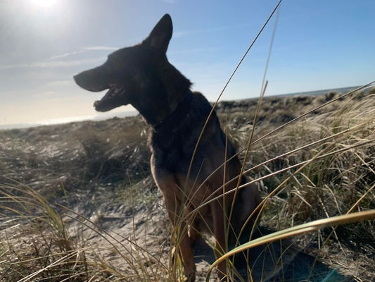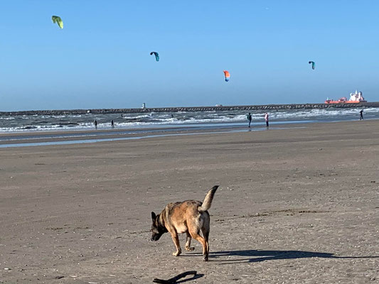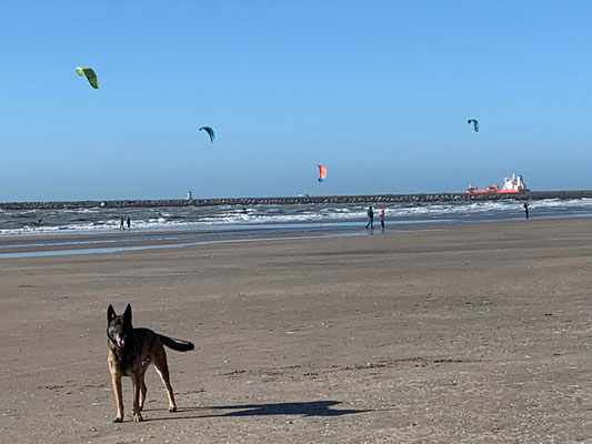 Sandor ist wie immer auf Sand – warum hat bloss der Strand so eine energetisierende Wirkung auf ihn … ? – voll aufgedreht und rennt herum, kaum von der Leine losgelassen, wie ein Luftballon, dem man die Luft rauslässt. Er vergnügt sich mit den anderen Hunden am Strand, bis am 1.4. dürfen die Hunde ja noch frei laufen. Unser Spaziergang führt den Strand rauf und dann wieder runter zum Hafen, wo ich die Einfahrt der riesigen Schiffe beobachte. Das Meer ist ziemlich aufgewühlt und jetzt würde ich nicht mit einem kleinen Boot unterwegs sein wollen …