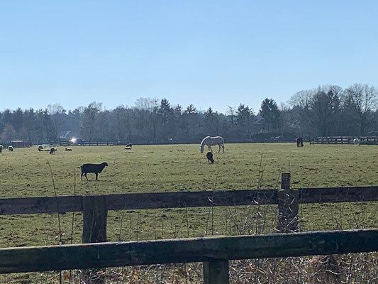 Wir laufen der Sonne entlang und über das Feld entlang der Weiden zurück, dort, wo Sandor 2x auf Hasenjagd war. Nun bleibt er dort natürlich an der Leine, wir werden heute nicht von Hasen empfangen, sondern von Enten. Heerscharen von Enten, so lustig! Und dieses Gegacker 😊 … was die sich wohl alles zu erzählen haben … die Enten sind auf dem Bild sehr gut getarnt, wenn du sie entdecken willst, musst du wahrscheinlich das Bild vergrössern.