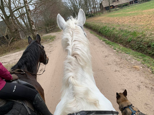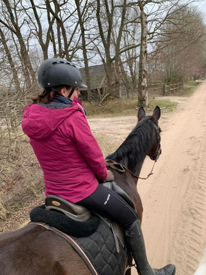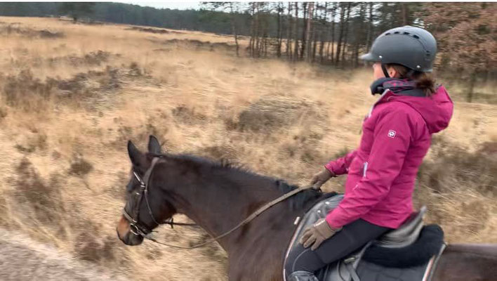 Am Nachmittag gehen wir auf einen längeren Ausritt ins Roekele Bos, Ines sattelt Dark und ich darf Harry nehmen. So riesig er ist, er ist auch ein riesiger Schatz, gutmütig und doch etwas eigen. Wir geniessen den Ausritt durch den Wald, über die Sandpisten, machen viel Schritt, ab und zu Trab und auch ein paar längere Galopps, die Pferde sind beide gechillt und trotzdem gut im Vorwärts, es ist einfach herrlich. Das Wetter ist absolut ideal, der Himmel ist etwas bedeckt und eigentlich wäre Regen angekündigt gewesen, es tropft jedoch nur ganz kurz zum Schluss und dann kommt auch wieder die Sonne zum Vorschein. Für die Natur wäre ein ausgiebiger Regen Segen, alles ist sehr trocken und die Sandpisten beginnen nun auch zu stauben. Durch die wärmeren Temperaturen und den vielen Sonnenschein ist die Natur dem Frühling auch schon ein Riesenschritt näher. In den zwei Wochen meiner Abwesenheit haben viele Bäume begonnen mit Blühen, und bei denen, die keine Blüten haben, drücken die grünen Spriesse schon überall durch. Wenn man in den Wald schaut, sieht es zwar immer noch recht braun und karg aus, wenn man dann allerdings genauer hinguckt, sieht man überall die grünen und bunten Farben auf der Lauer liegen. Ich denke, wenn es jetzt mal so richtig regnet, wird der Frühling explodieren.