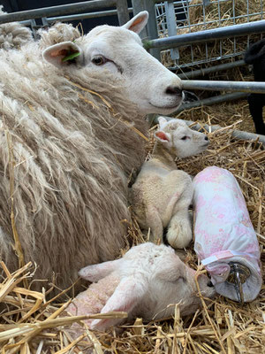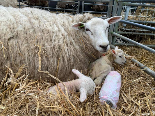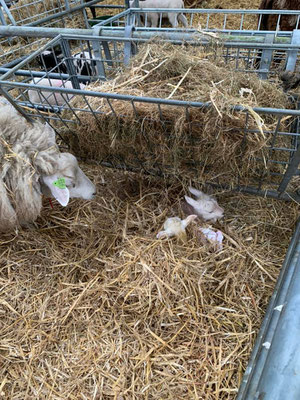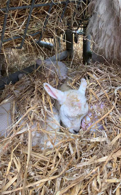 Irgendwann am späteren Mittag gehe ich dann mal einkaufen – bzw. zuerst mal die Hosen wechseln und mich waschen, mit diesen blutigen Händen kann ich mich ja nicht rauswagen 😊. In der Zwischenzeit schaut sich der Tierarzt die Lämmer an, er ist zwar für die Kühe gekommen, die gestern neu angekommen sind, kontrolliert nun auch die Lämmchen. Er gibt beiden eine kleine Chance zum überleben, das sind doch mal good News. Die Beine beim grösseren Lämmchen sind so verdreht und schwach, weil er sich wahrscheinlich im Mutterleib mit den anderen drei Geschwistern so ineinander verhakt hat. Es besteht die Chance, dass sich das «auswächst».