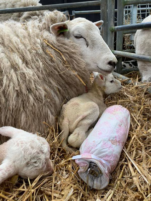 Diese kleinen hilflosen Bündel rühren mein Herz und ich setze mich zu ihnen und versuche mein Bestes, dass sie wenigstens nicht mehr frieren. Das grössere setze ich immer wieder an die Zitzen der Mutter und es trinkt sogar. Selber stehen geht leider gar nicht, die Hinterbeine sind irgendwie verdreht und total spannungslos. Das ganz kleine Lämmchen rührt sich zunächst überhaupt nicht, ich versuche, es mit kreisenden Bewegungen mit dem Stroh etwas warm zu halten und den Kreislauf anzuregen. Willemiek bringt noch zwei wärmende Bettflaschen, an die sich die Lämmchen kuscheln können, und als sie dann auch die Biestmilch bringt, die sie immer auf Vorrat im Kühlschrank hat, trinkt der ganz Kleine. Und sogar sehr gut! Das Trinken scheint seine Lebensgeister zu wecken, es fängt an, den Kopf zu heben und zu määhen, leise zwar, immerhin. Ich bleibe bei den Kleinen, sicher 2 Stunden lang, gebe ihnen immer wieder die Flasche, halte sie mit Stroh und Streicheln und der Wärmeflasche warm und helfe trinken. So langsam aber sicher keimt die Hoffnung auf, dass sie es schaffen könnten …