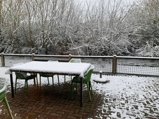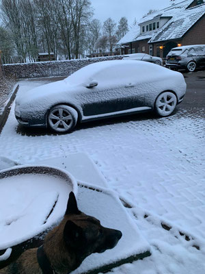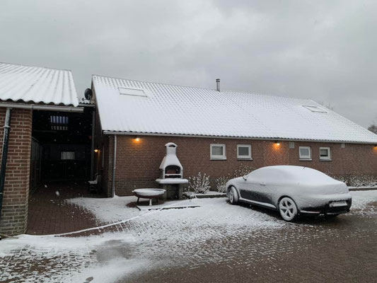 Wow, heute Nacht hat es gehörig geschneit und es hat noch mehr Schnee als gestern. Und es ist sehr kalt geworden. Harry hatte leider in der Nacht eine Kolik und Willemiek möchte ihn nicht auf die Schneeweide lassen, also bleiben er, Charlie (das schwangere weisse Pony) und Dark drinnen. Sie dürfen in dem (Kuh-)Auslauf gegenüber den Boxen rumlaufen und das gelagerte Heu fressen. Obwohl, es ist ja eben kein Heu, sondern Silage und ich bin überzeugt, dass Harry die Kolik nicht vom Schnee sondern von diesem Silage hat. Seit mehreren Tagen ist leider kein Heu verfügbar und ich habe mich noch gefragt, ob das gut geht, wenn die Pferde nur das fressen.