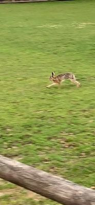 dem Feld und im Gebüsch rum. Es sind viele Hasen, sicher so 10, und sie hüpfen munter rum und schlagen ihre Haken über die Felder. Und auch über die Weiden, ich staune, wie nahe sie uns kommen.