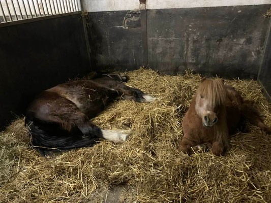 Gijs, das Fuchsshetty, ist liegend neben seiner Freundin und wacht über sie. So ein herziges Bild. Teddy wird dann schlussendlich auch wieder wach, als ich Gijs den Wasserkübel in die Boxe