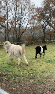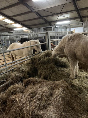 Also bastle ich den Laufstall so um, dass alle Ponys und Lucky, das Kälbchen, wie ich es ab heute nenne, dort frei rumlaufen und auch alle an einem Heuhaufen fressen können. Das gelingt nicht. Charlie mag Pablo nicht und zickt ständig rum, Pablo ist sehr unruhig und alle Ponys jagen Lucky. Also neuer Versuch, Lucky und Pablo kommen in den Laufstall nebenan. Dort sind zwar die Ballen Heu und Stroh und Silage deponiert, ich hoffe jedoch, dass das trotzdem irgendwie gehen wird.