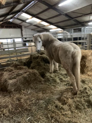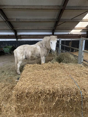 Als ich dann fertig bin mit allen misten, kommt Willemiek und mistet die Ponys und Harry, ich gehe in der Zwischenzeit ins Haus frühstücken. Über den Mittag will ich dann mit Pablo in den Wald gehen, damit er nicht den ganzen Tag in der Boxe rumstehen muss und wow, als ich in den Stall komme, steht er im Auslaufstall mit dem frischen Heu und Stroh. Offenbar hat ihn Willemiek dorthin getan, so lieb. Er geniesst das Fressen von seinem Heutrohn aus - siehe Bilder :-).