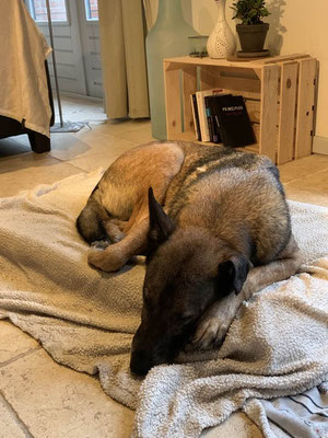 Also, alle schnell raus, rein ins Haus, Calls und einkaufen gehen inklusive Mittagsspaziergang und wieder Arbeit. Als ich am Abend mich entscheide, etwas früher in den Stall zu gehen, da ich ja noch den Laufstall misten will, bevor das Kalb wieder da reinkommt, merke ich - uuuuups, Boxen misten vergessen! Ich hatte am Morgen früh bereits einen Call und gedacht, misten kann ich später und habe es völlig vergessen. Egal, schnell misten, alle reinholen und dann gönne ich mir einen faulen Abend vor dem Fernseher :-). Auch Sandor scheint heute ziemlich faul und geniesst das Schösselen.