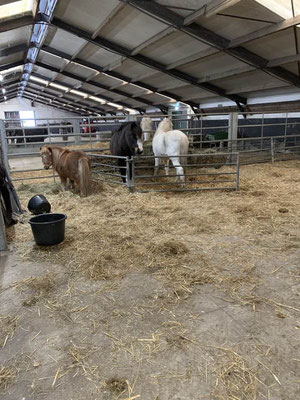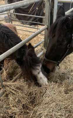 Also, erstmal die Pferde inkl. Tommy auf die Weide. Ich bringe ihnen noch viel Heu, sodass sie erstmal nicht das Grasglacé fressen.