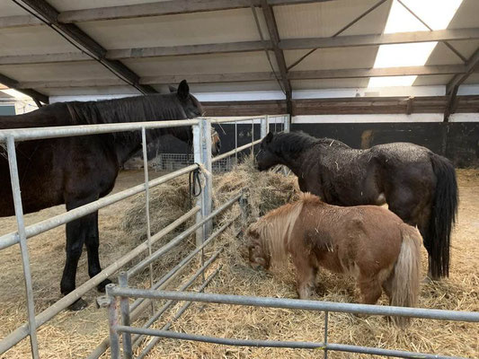 Heute scheint - äusserlich - wieder die Sonne, ich hoffe sehr, dass dies ein gutes Omen ist. Teddy geht es heute besser, und ich lasse sie und Gijs wieder in den Laufstall, miste den Kälberstall gründlich und entferne die Hälfte der Absperrungen. So können die Ponys auf das Stroh (ist weicher für die Hufe von Teddy) und ich sehe, es bringt was. Bald stehen beide auf der Strohmatte und geniessen genüsslich das Heu. Wie schön, Ziel erreicht, ich hoffe nur, dass Willemiek sie nicht wieder auf das Aussenviereck schmeisst.