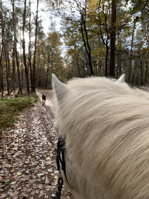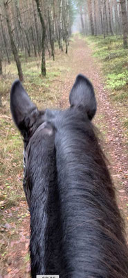 Dark ist heute völlig aus dem Fell, er erschrickt ab jedem Piep. Und jeder Baum ist gefählich - und das im Wald. Keine Ahnung, was heute los ist. Ich galoppiere recht viel und anstatt dass er ruhiger wird, dreht er immer mehr auf. Wir begegnen wieder anderen Pferden, dies meistert er zwar recht gut, ich merke jedoch, dass er sich immer mehr aufheizt. Als er wieder mal völlig erschrickt. und ich habe keine Ahnung wieso, übe ich mit ihm das Stillstehen. Einfach nur stillstehen. Das geht gar nicht. Er wird immer aufgeregter und piaffiert vor sich hin. Er dreht und windet sich, stillstehen ist absolut nicht möglich. Hä, was ist bloss los?