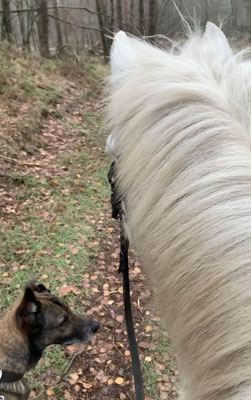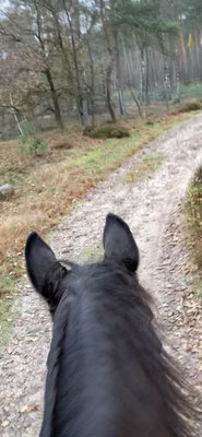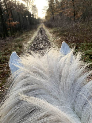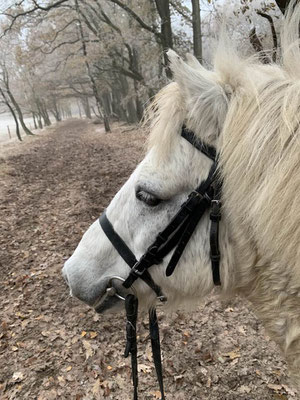 Keine Ahnung, was heute in ihn gefahren ist, ich lasse ihn am langen Zügel heimstressen und nehme mir vor, auch im Wald das Stillstehen mehr zu üben. Auf jeden Fall sind wir lange unterwegs und trotz Kälte komme ich ziemlich ins Schwitzen, ausser die Füsse. Die frieren mir fast ab, ich muss echt bald mal Winterreitstiefel kaufen gehen ...
