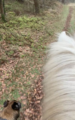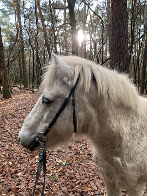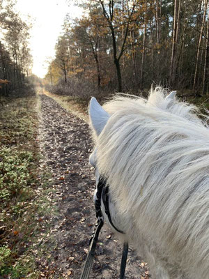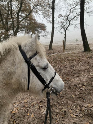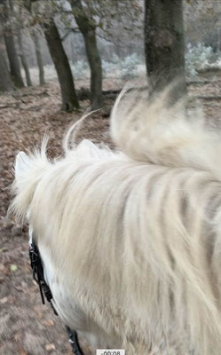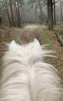 Auch der Reit-/Spaziergang mit Pablo macht Spass heute, er ist richtig gut drauf und wir sind doch recht lange unterwegs. Da er so fit ist, hocke ich für den Trab und auch für ein ganzes Stück Galopp kurz drauf und geniesse die "Sitzheizung". Ist doch ziemlich kalt heute, wenn man sich bewegt geht's. Der Nebel verschwindet nicht und taucht den Wald in ein weisses Licht, es sieht toll aus. Fehlt nur noch der Schnee, den es offenbar in der Schweiz genügend gab.
