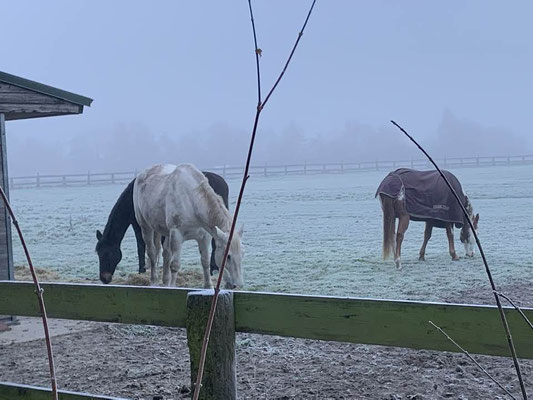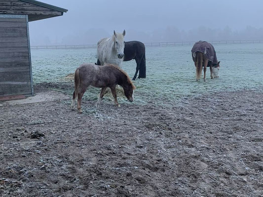 Wowwww, heute ist kalt, alles gefroren! Und der Nebel hängt dicht über dem Boden, es sieht alles sehr mystisch aus. Da das Gras gefroren ist, kommen die Ponys heute den ganzen Tag nicht auf die Weide. Das Misten wird ein bisschen eine logistische Herausforderung ...