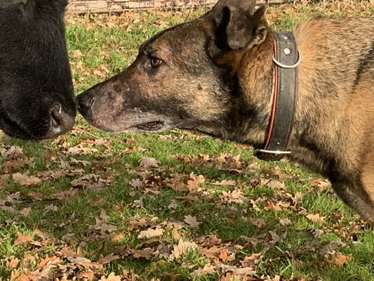 Als ich den Roekelse Zandweg entlang reite, kommen mir 3 riesige Traktoren entgegen. So gross, dass weder links noch rechts davon Platz ist, um vorbeizukommen. Der erste hat eine riesige Schaufel und ist dran, die Kanäle zu säuber. Die beiden Traktoren dahinter haben Anhänger angehängt mit leistungsstarken Bläsern, die das Laub von der Strasse fegen. Einer für die linke Seite, einer für die rechte Seite. Auweia. Ich weiche auf eine Hofeinfahrt aus, die Traktoren fahren ca. 3 Meter vor uns durch und Dark - macht keinen Wank!! Guckt ein bisschen, aber nix Panik oder Angst ... Er ist heute eh ziemlich entspannt.