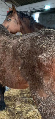 Am Abend zieht es mich zu den neuen Pferden. Sie tun mir sehr leid und sie sind recht unruhig. Ich versuche, die beiden Pferde, die im schlimmsten Zustand sind, etwas zu putzen. Ihr Fell ist so verkrustet mit Dreck und Scheisse, dass ich da mit der Bürste kaum durchkomme. Willemiek warnt mich, sie sind "wild", dh. sie kennen nichts, und ich soll vorsichtig sein.