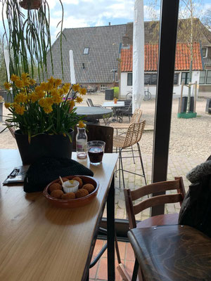 Morgen kommen meine beiden Kolleginnen Tanja und Alena von Santis zu Besuch und ich gehe den Veloweg über Ede in die Mossel rekognoszieren. Der Weg ist ca. 15 km und eine schöne Runde durch die Heide, allerdings habe ich vor allem auf dem offenen Feld vor allem Gegenwind. Egal, ich habe ja Zeit und geniesse die Fahrt und gönne mir dann in der Mossel auch einen Snack. Natürlich die üblichen Vegi-Bitterballen, die sind superfein!