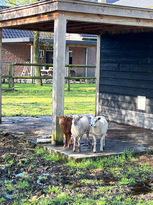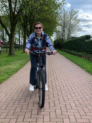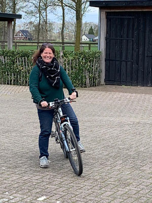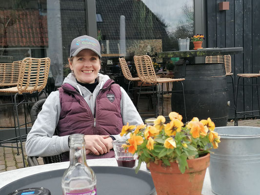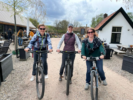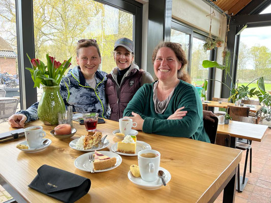 Heute ist ein Ausflug in die Boerderij Mossel mit den Velos dran, und da das Wetter am Nachmittag umschlagen soll, fahren wir gleich nach dem Mittag los. Die Velos der Kassings stehen uns wieder zur Verfügung, das ist sehr nett. Alena ist schon seit Ewigkeiten nicht mehr Velo gefahren und so muss sie sich zuerst an das Schalten mit den Gängen gewöhnen, und prompt schafft sie es, dass ihr die Kette rausspringt. Kein Problem, ich bringe die Kette wieder auf das Zahnrad, nur habe ich jetzt schwarze Finger. Egal, gibt schlimmeres und wir geniessen die Fahrt Richtung Ede und dann in die Mossel. Nach ca. 1 Std. Fahrt haben wir uns einen feinen Borrel verdient. Die Sonne macht sich langsam rar und so bestellen wir Kaffee und Kuchen dann drinnen.