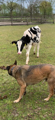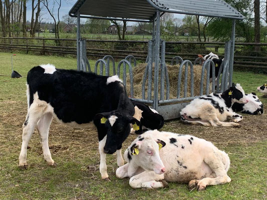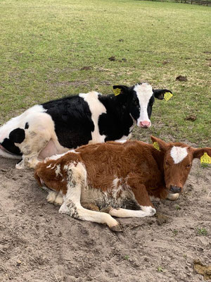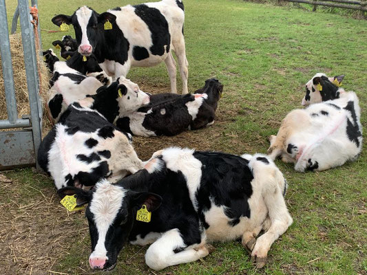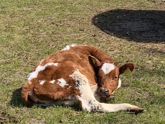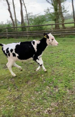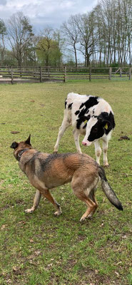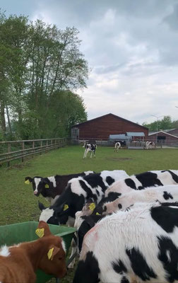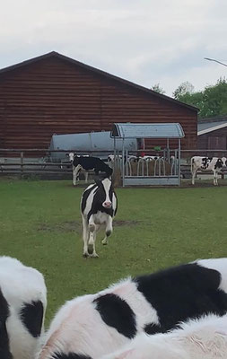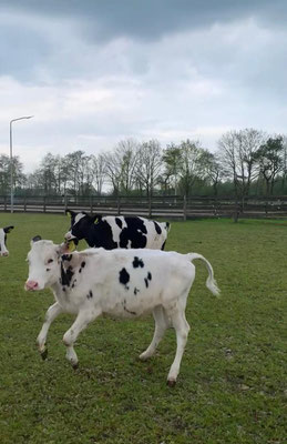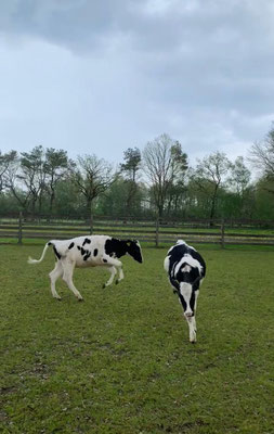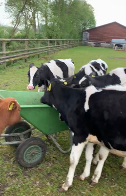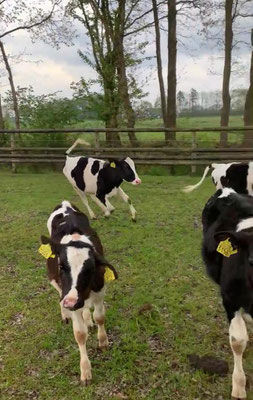 Nach den tollen Pferden geht es wieder ab zu den tollen Kälbchen - Weide abbollen, Kälbchen streicheln und an Menschen gewöhnen. Heute haben sie Silage gekriegt und sind gut gelaunt. Sie verfolgen mich bzw die Mistkarrette und haben so ihre spinnigen Minuten, dann flitzen sie im Vollspeed über die Weide und spielen miteinander. So schön zu sehen!