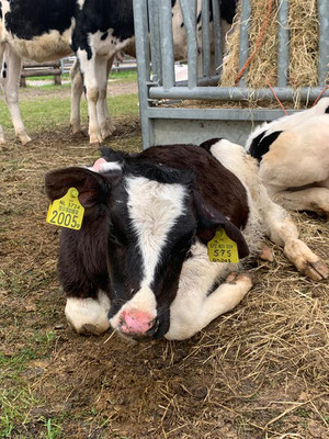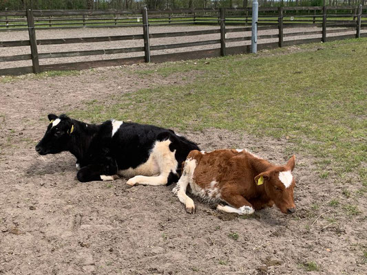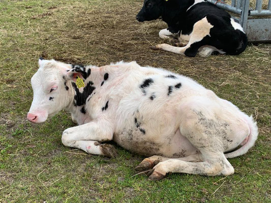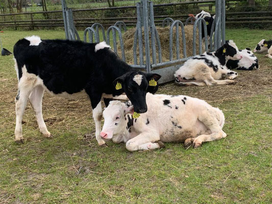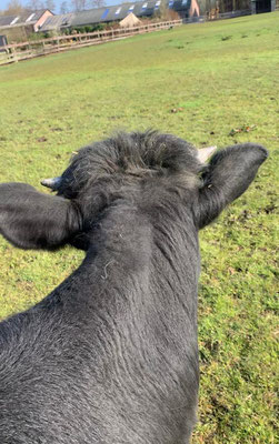 Meine Beiden kennen mich bereits und sind schon recht zutraulich. Ich kann mich sogar neben Happy setzen während sie liegt und sie kraulen, wie schön ist das denn. Browny (das einzige braune Kälbchen) ist recht forsch und kommt ab und zu sogar zu mir, um seine Streicheleinheiten einzufordern. So herzig.