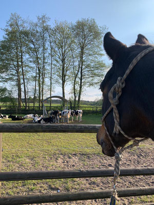 Am Abend versuche ich es dann, mit Dark auf dem Viereck zu reiten. Auch unter dem Sattel bleibt er sehr brav, drückt an der Kälbchenweide entlang zwar weg, ist jedoch wirklich erstaunlich gelassen. Auch die Kälbchen, was mich erstaunt, denn ich habe beobachtet, dass sie wie wild rumrennen, wenn Indy im Viereck ist. Spannend ...