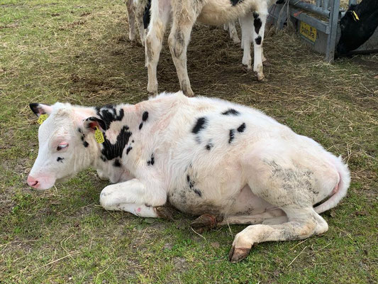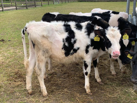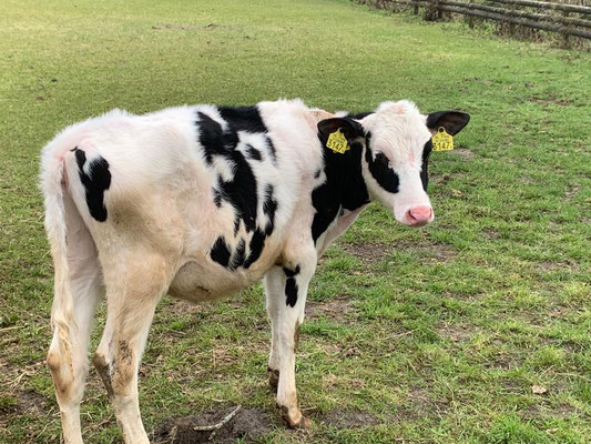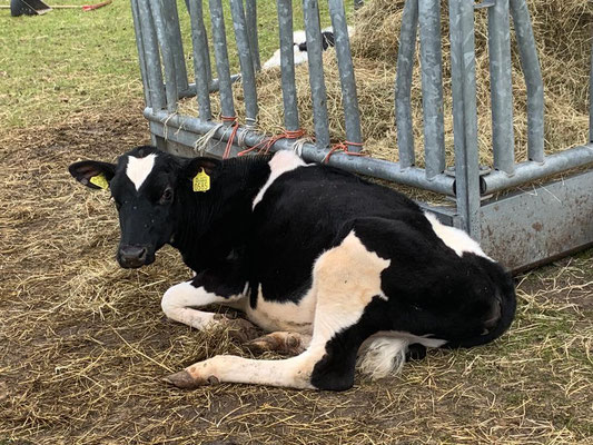 Auch heute ist wieder meistens sonniges Wetter, allerdings immer noch sehr kalt, vor allem der Wind (finde ich jedenfalls). Etwas wärmer wird mir, als ich über den Mittag wieder die Kälberweide abbolle. Vor allem ums Herz, sie sind so schnusig, die Kälbchen. Und sie werden eeeetwas zutraulicher, einige wenige von ihnen kann ich bereits ein bisschen anfassen. Am besten geht es mit "meinen" beiden, den beiden kleinsten. Sie sind nur die Hälfte der anderen und die anderen sind schon mager und klein ... "Meine" beiden sind das Braune und das Schiefe, das ich nun "Happy" taufe. Es soll eine happy Kuh werden.