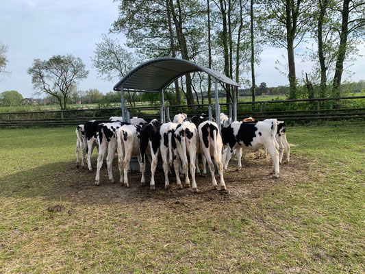 Da ich heute morgen noch kurz nach Ede gehe, um Einkäufe zu machen, kann ich die Kälberweide erst am Nachmittag abbollen. Leider fängt es genau dann auch an zu regnen und ich werde pitschnass. Das macht mir allerdings nicht viel aus, denn was wäre ich für eine Bäuerin, wenn ich Regen nicht mag :-). Auch heute muss ich ihnen wieder Heu bringen. Die Kleinen werden alle auch patschnass, da es allerdings nicht sehr kalt ist, denke ich, dass sie den Regen eher schätzen. Viele von ihnen haben juckende und offene Stellen im Fell und der Regen tut da bestimmt gut.