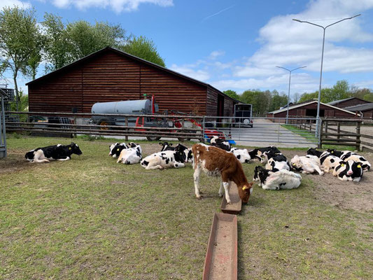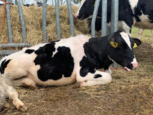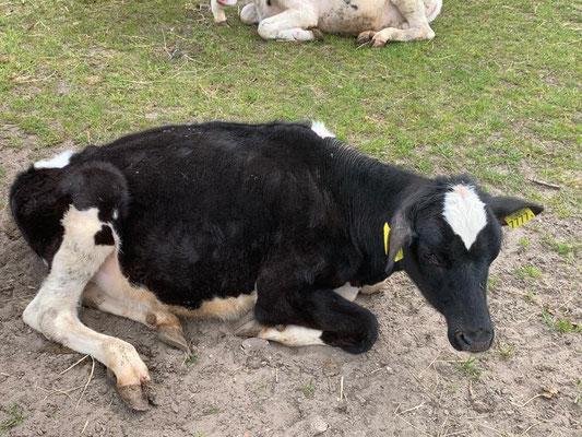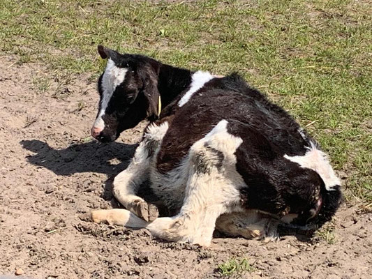 Diese beiden kann ich schon ziemlich gut anfassen und auch kraulen. Sie scheinen es zu lieben, wenn sie gekrault werden, jedenfalls bleiben sie dann stehen und verdrehen den Kopf :-). Als ich fertig bin mit Abbollen, sind die Kälber auch alle fertig mit essen und legen sich in die Sonne zum Wiederkäuen. Was für ein friedliches Bild, welche Ruhe hier herrscht, es ist einfach nur wohltuend.