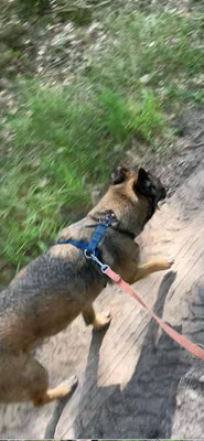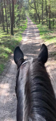 Den Ausritt mit Dark geniesse ich sehr, es ist super Wetter, ideal um zu reiten. Nicht zu heiss, sonnig und noch fast keine Fliegen, mega. Dark ist motiviert und macht gut mit, allerdings muss ich langsam machen, denn ich merke, dass Sandor nicht mehr so mag. Wir passen unser Tempo als dem Hund an.