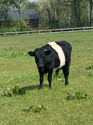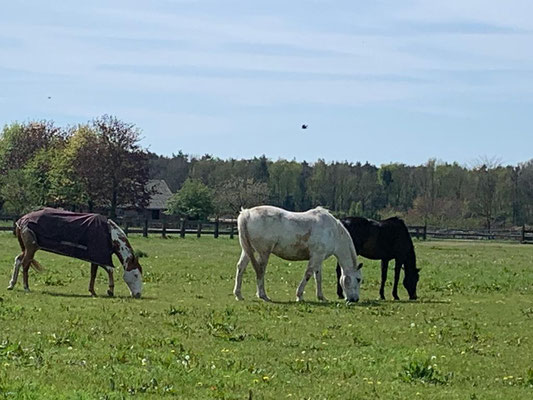 Da das Wetter immer noch schön und angenehm ist, geniesse ich dieses Draussensein bei den Tieren sehr. Ich sehe direkt rüber auf die Weide der Pferde und kann sie gut beobachten, und auch Lucky kann ich so beobachten. Alle sind zufrieden und fressen gut. Lucky kommt wieder an den Hag, sobald er mich entdeckt hat, er muht ein paar Mal, legt sich dann jedoch hin zum Wiederkäuen. Er scheint sich arrangiert zu haben.