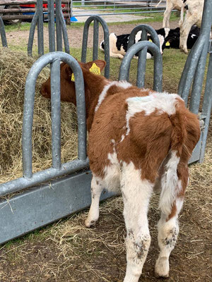 Egal, ich geniesse heute in vollen Zügen "meine" Kälbchen. Nach dem Morgenstall gehe ich einkaufen und besorge Kälbermilch. Oh, ganz schön teuer, aber das wird ihnen gut tun! Vor allem die beiden Babys, das Braune und das Schiefe, werde ich mit Milch etwas auffüttern.