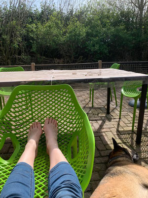 Nach getaner Arbeit gönne ich mir eine Ruhepause auf der Terrasse und lasse mir die Sonne ins Gesicht scheinen. Es ist so schön warm, richtig Frühling. Allerdings halte ich es nicht lange aus, da die Nachbarn lautstark diskutieren und verziehe mich zu einem Spaziergang mit Sandor in den Wald. Danach bringe ich den Kälbchen Heu auf die Weide, sie hatten schon am Morgen nichts mehr, und da weit und breit kein Marco zu sehen ist, der das Heu bringen sollte, fülle ich halt die Heuraufe selber auf. Die Kälbchen danken es mit Muhen und Fressen :-)