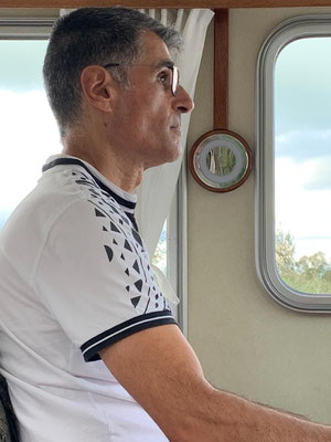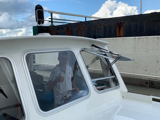 Was wir hier merken: Sandor hat riesigen Respekt vor dem Ausstieg bei so einem schmalen Steg. Obwohl wir das Boot ganz nahe am Steg parkiert haben und der Ausstieg auch fast eben"stegig" ist, hat er riesigen Stress, auszusteigen. Einsteigen geht komischerweise ... Sein Respekt rührt wahrscheinlich noch von seinem Badeerlebnis der letzten Bootsferien her ... Mit Geduld und festhalten geht es dann allerdings alles gut.