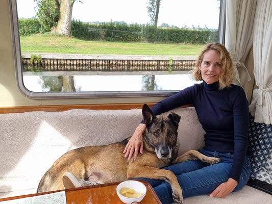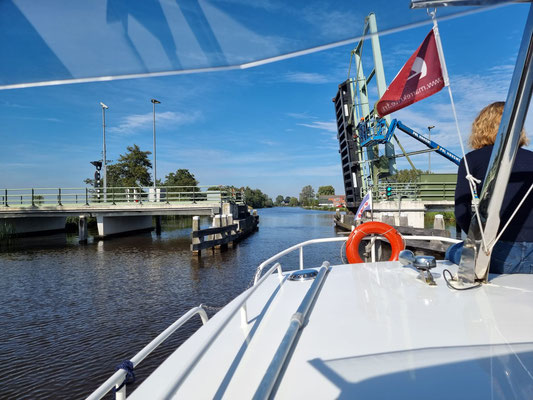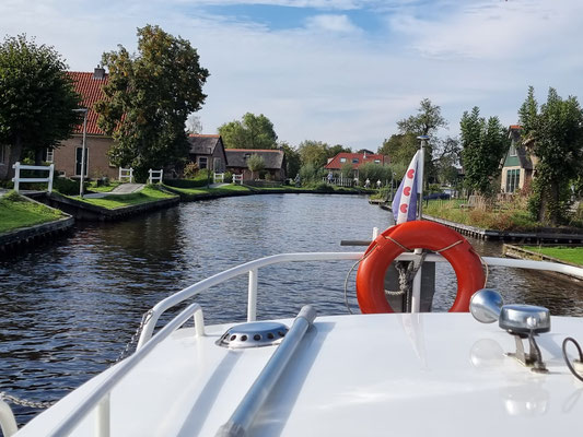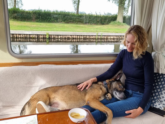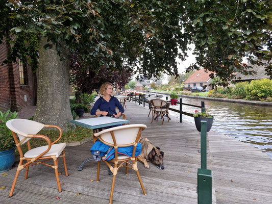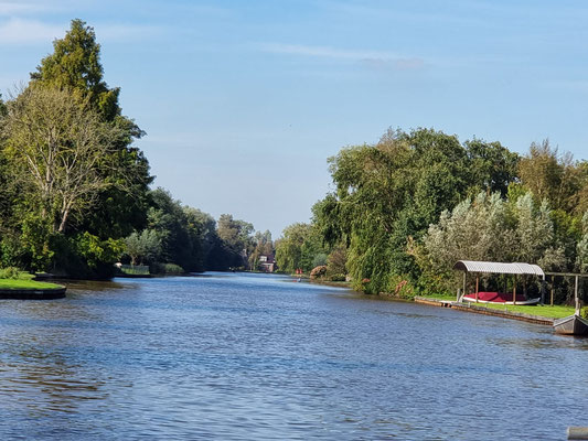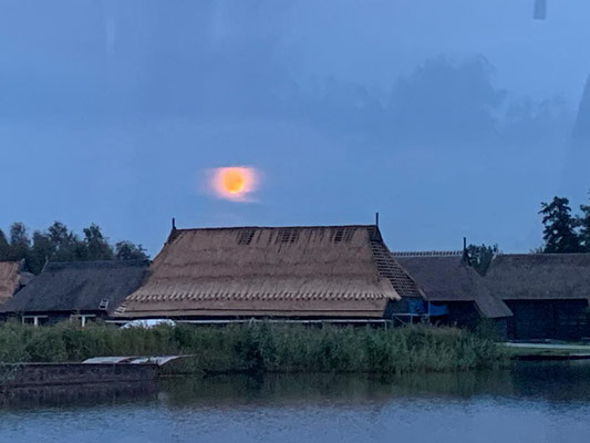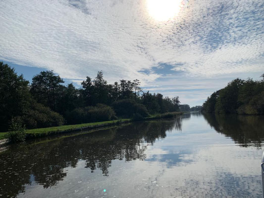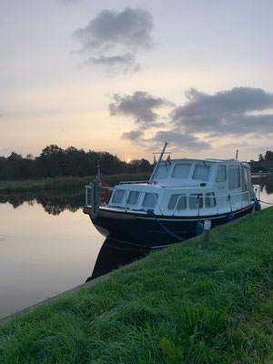 Das Wetter macht schnell auf und es wird herrlich sonnig. Wir fahren Richtung Ossenzijl und machen die Kalenberger Gracht dieses Mal von der anderen Seite. Auch von dieser Seite ist sie wunderschön und wir geniessen ein sehr langsames Tuckern durch die Torf-Naturlandschaft der Weerribben. Nach Kalenberg legen wir an einem Steg an und sind so quasi mitten in der Natur und campieren auch heute wieder wild. Wir sind hier fast alleine auf weiter Flur, es liegt nur noch ein Boot nebendran, das dann irgendwann jedoch auch wegfährt und wir sind alleine. Da Antonio nicht genug kriegen kann von Kalenberg, laufen wir nochmals zurück ins Dorf und trinken dort im Brückenrestaurant etwas, bevor wir uns wieder zurück aufs Boot machen. Der Vollmond zeigt sich leider nur zu Beginn kurz, wunderschön, dann verschwindet er hinter den Wolken und wir im Bettchen. Das letzte Bild ist die Fanny am Donnerstag Morgen, da waren die Wolken schon fast wieder alle weg.
